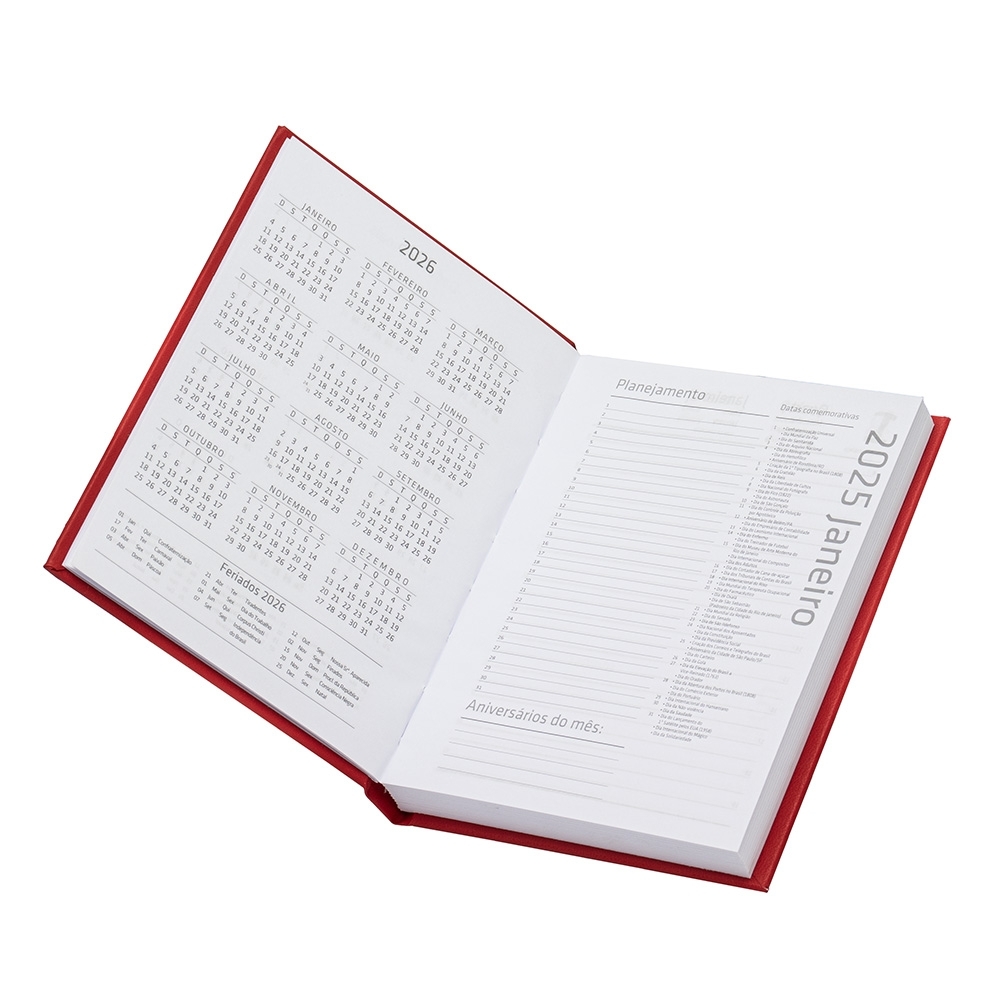 Agenda 2025 com capa em cromato personalizado, contém páginas para dados pessoais, calendários de 2024 à 2026 e planejamento.
