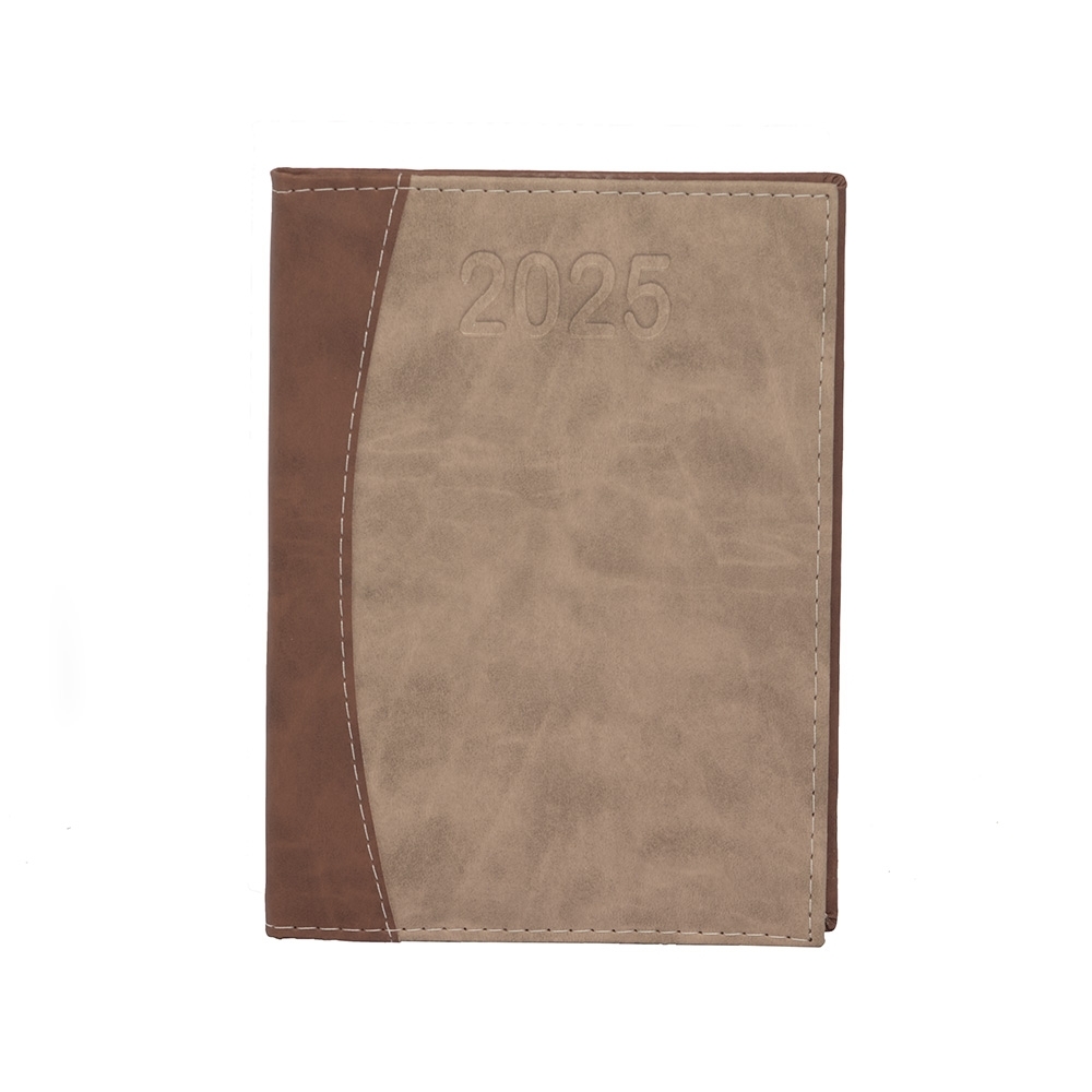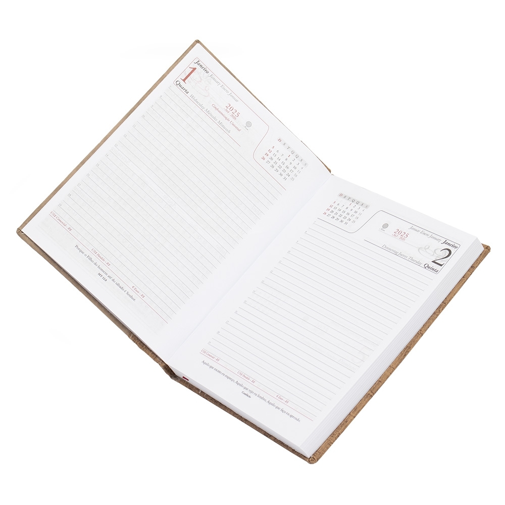 Agenda diária 2025 de couro sintético personalizada. Contém fita de cetim marca página, dados pessoais, calendário de 2024 à 2026, mapa do Brasil, mapa-múndi, índice telefônico e planejamento. OBS.: PEDIDOS APENAS MÚLTIPLOS DE 10 PEÇAS!