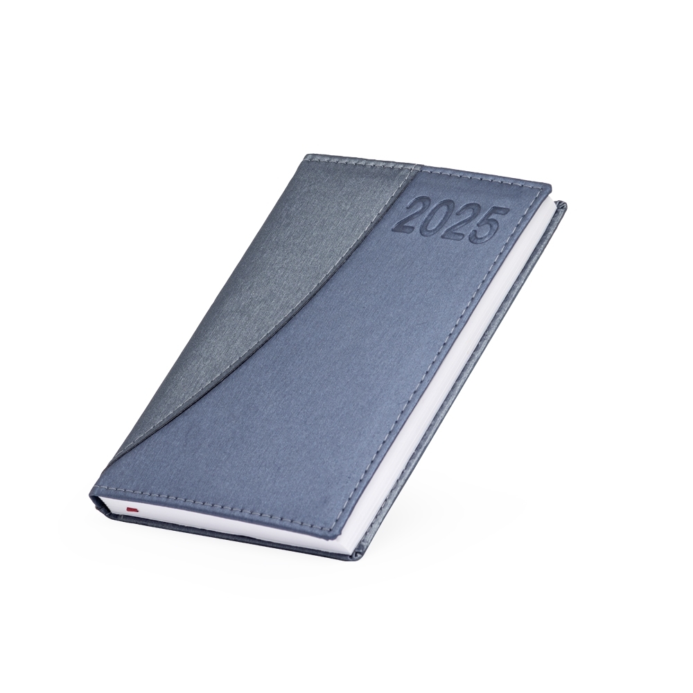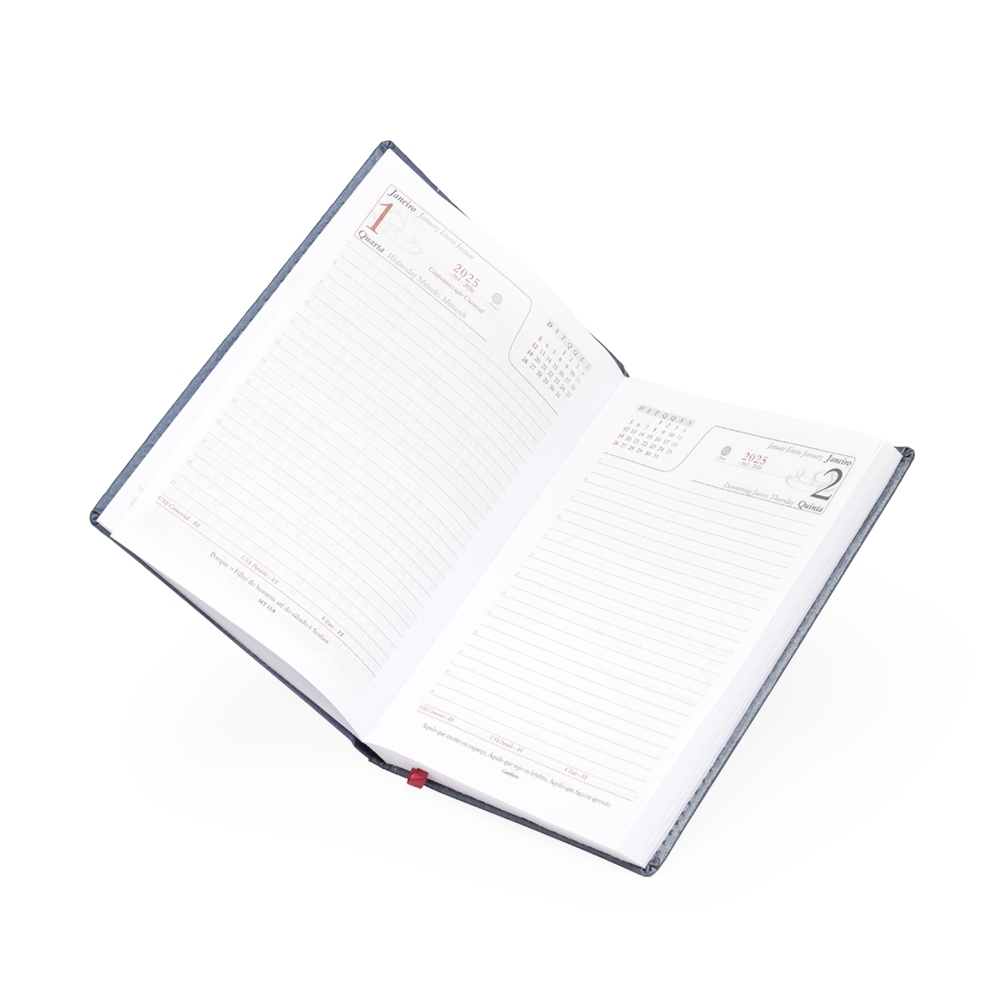 Agenda diária 2025 de couro sintético personalizada. Contém fita de cetim marca página, dados pessoais, calendário de 2024 à 2026, mapa do Brasil, mapa-múndi, índice telefônico e planejamento. OBS.: PEDIDOS APENAS MÚLTIPLOS DE 10 PEÇAS!