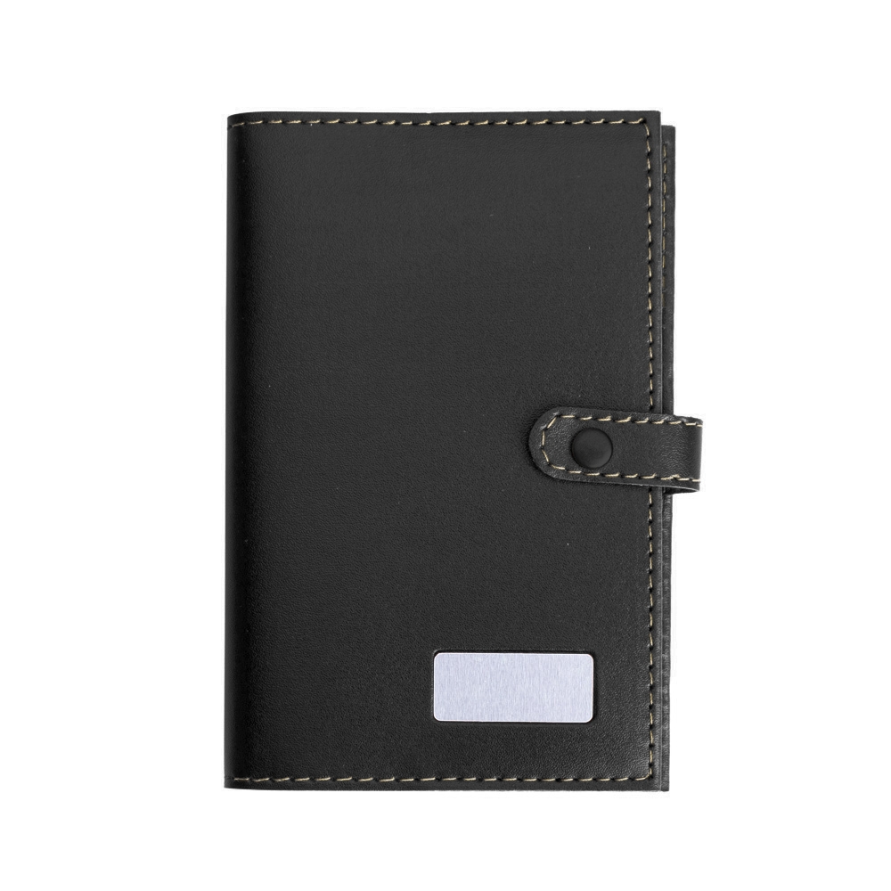 Bloco de anotações personalizado Bidins em couro sintético com plaquinha metálica para personalização. Possui botão para lacre, parte interna com aproximadamente 70 folhas brancas sem pauta e marca página de cetim.