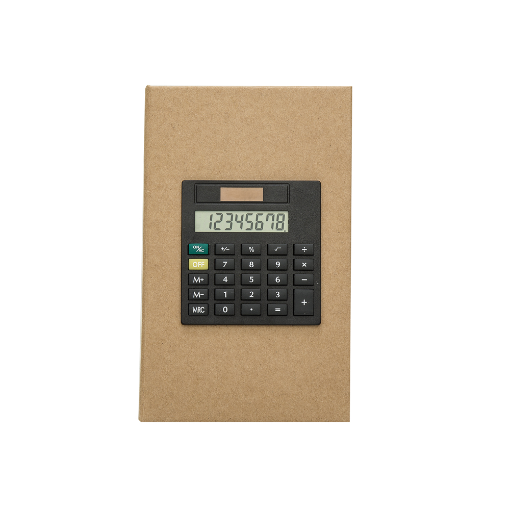 Bloco de anotações ecológico personalizado com calculadora. Bloco de kraft com calculadora solar de 8 dígitos acoplada na capa; parte interna com bloco amarelo de aproximadamente 26 folhas; seis bloco auto-colantes coloridos com aproximadamente 35 folhas; bloco branco com aproximadamente 50 folhas sem pauta, possui trava superior metálica de pressão.
