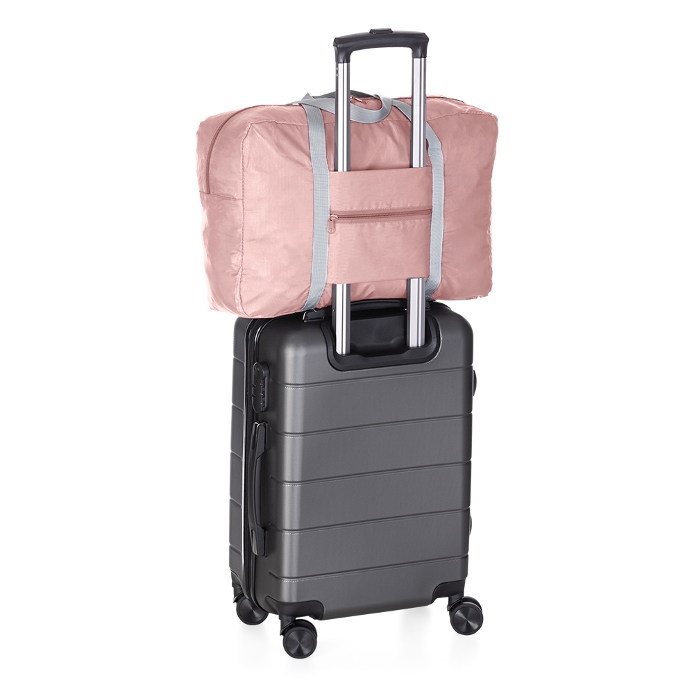 Bolsa de viagem personalizada dobrável confeccionada em poliéster e alça para mãos em nylon. Possui bolso principal na parte superior, bolso frontal também utilizado como um estojo para armazenamento do próprio produto e com área para encaixe em malas com puxador. Para guardar a bolsa dentro do estojo, posicione o bolso frontal para baixo, dobre a parte superior e inferior de modo que fique apenas o formato do bolso, faça o mesmo procedimento com as laterais para obter o formato quadrangular por completo. Com o lado do bolso virado para cima, posicione os dedos na parte interna superior e vire como se fosse deixá-lo do avesso, faça o mesmo procedimento com a parte inferior do bolso.