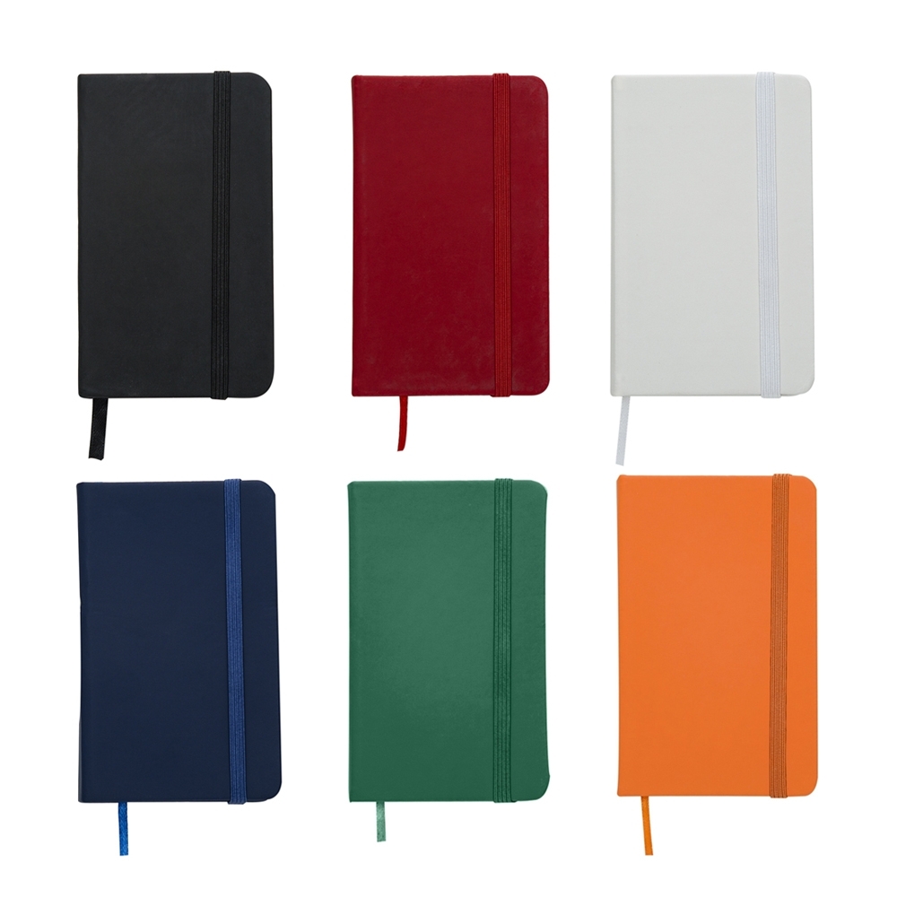 Caderneta emborrachada com elástico para lacre e marcador de página em cetim, contém aproximadamente 84 folhas com pauta na cor marfim. Altura : 13,1 cm Largura : 8,1 cm Espessura : 1,5 cm Medidas aproximadas para gravação (CxL): 12,5 cm x 7 cm Peso aproximado (g): 99