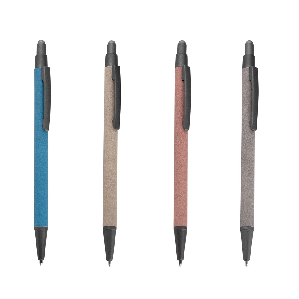 Caneta alumínio touch com pintura áspera colorida. Possui clip metálico e borracha touch no acionador. Acionada por clique.