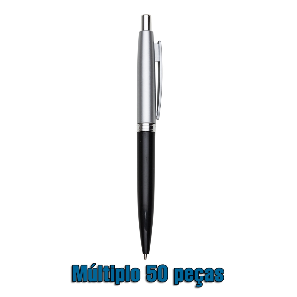 Caneta personalizada plástica prata com detalhe colorido. Clip plástico, possui anel central com detalhes em relevo. Aciona por clique. PEDIDO APENAS MÚLTIPLO DE 50 PEÇAS!