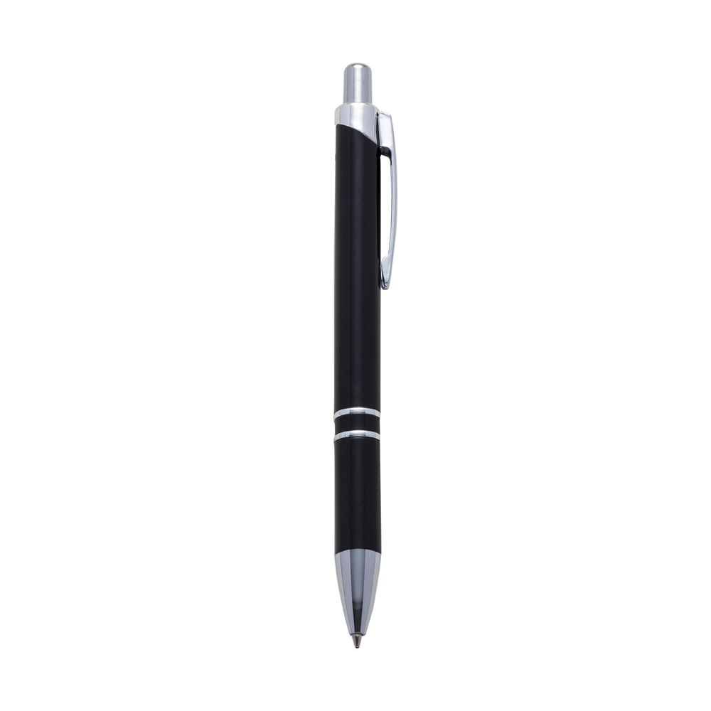 Caneta plástica personalizada inteira colorida com detalhes prata. Clip metal, possui dois anéis prata inferior. Aciona por clique.