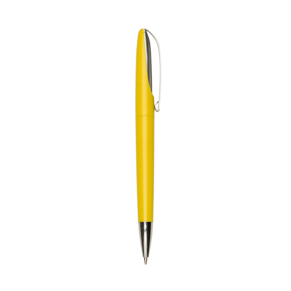 Caneta personalizada plástica inteira colorida com detalhes prata. Clip metal, basta pressionar o clip para acionar a esferográfica.