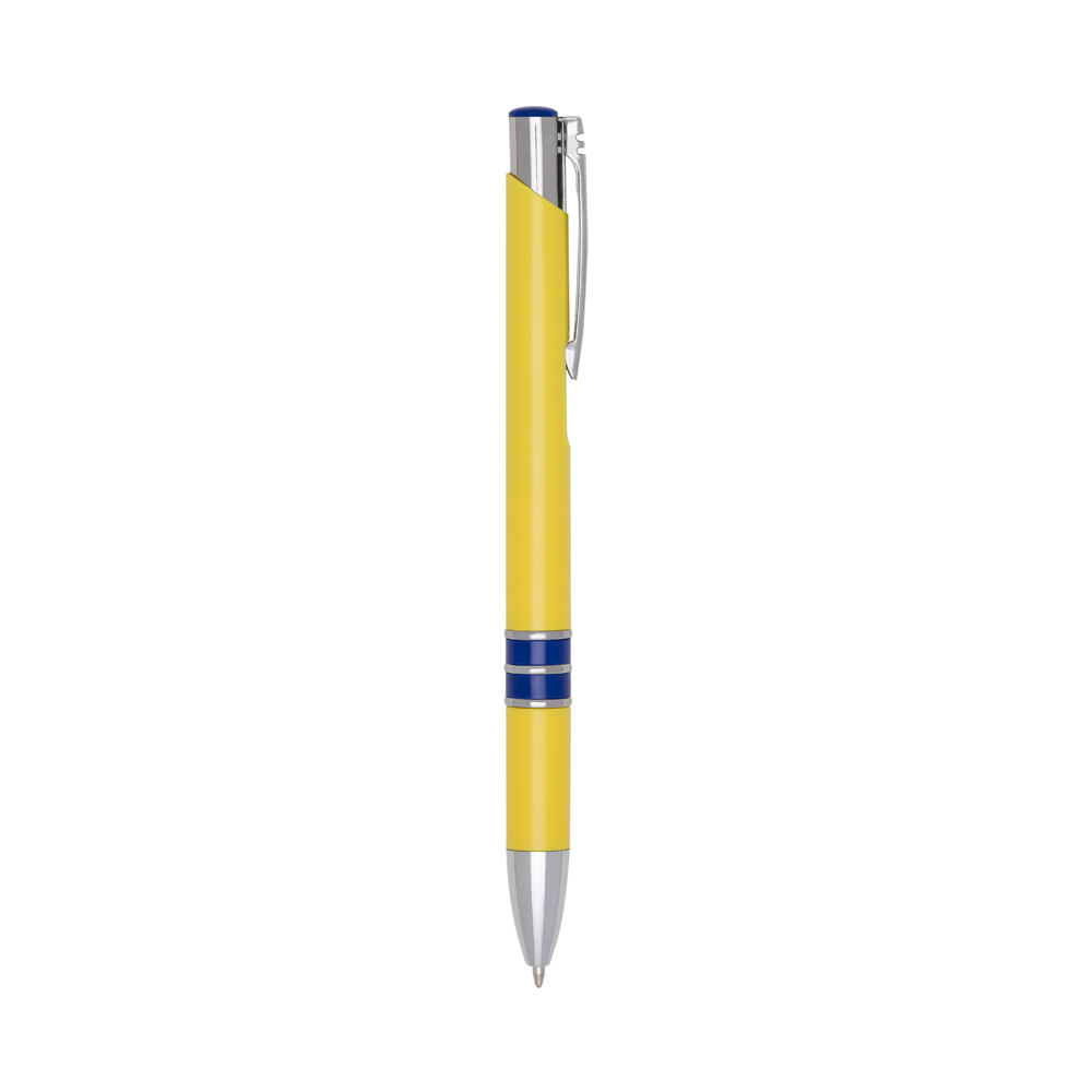 Caneta plástica personalizada amarela com detalhes coloridos. Ponta do acionador colorido e clip metal, possui 3 anéis inferiores e detalhes em prata. Aciona por clique.