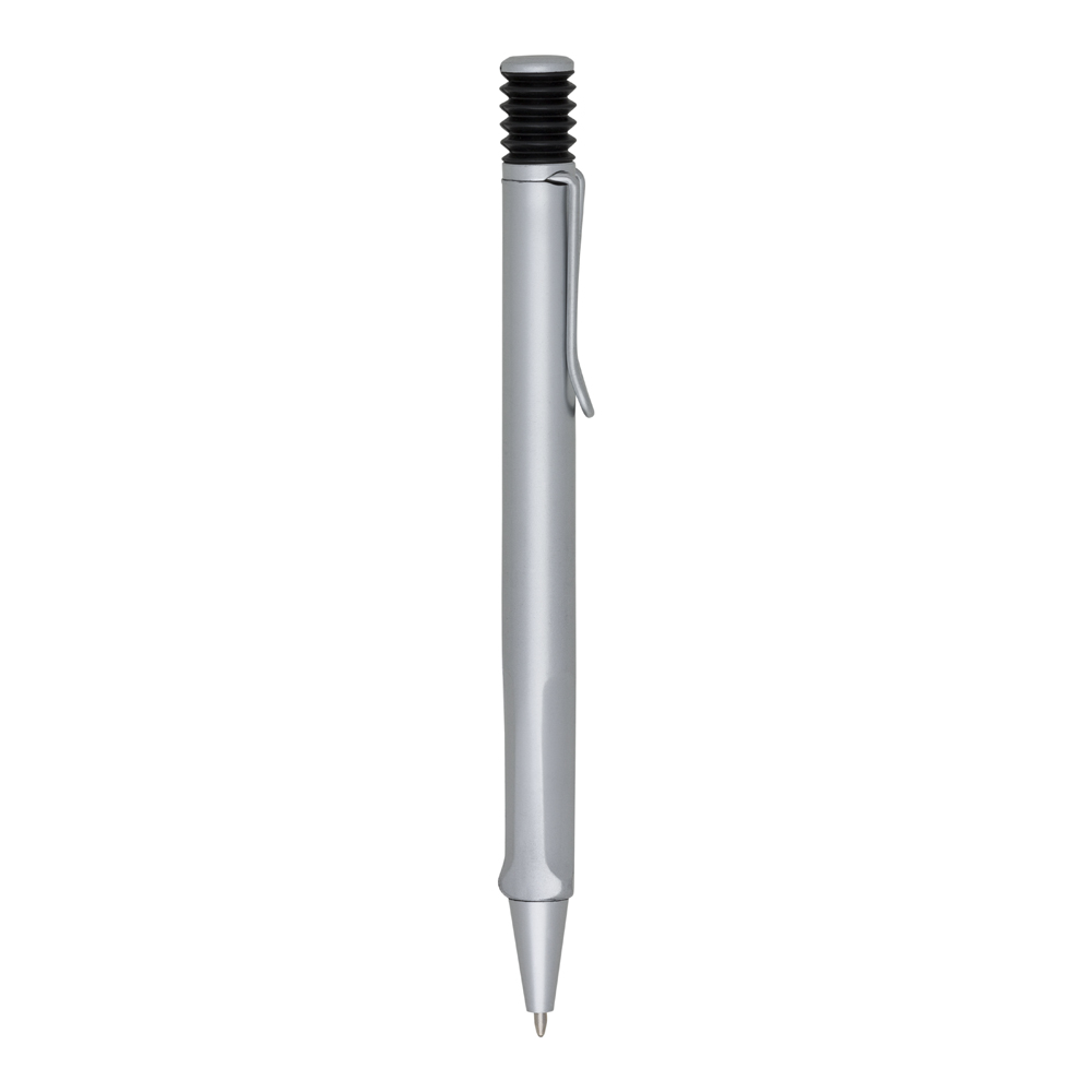 Caneta plástica fosca inteira colorida com detalhes prata personalizada. Acionador com design de mola e clip metal, possui relevo na parte inferior. Aciona por clique.