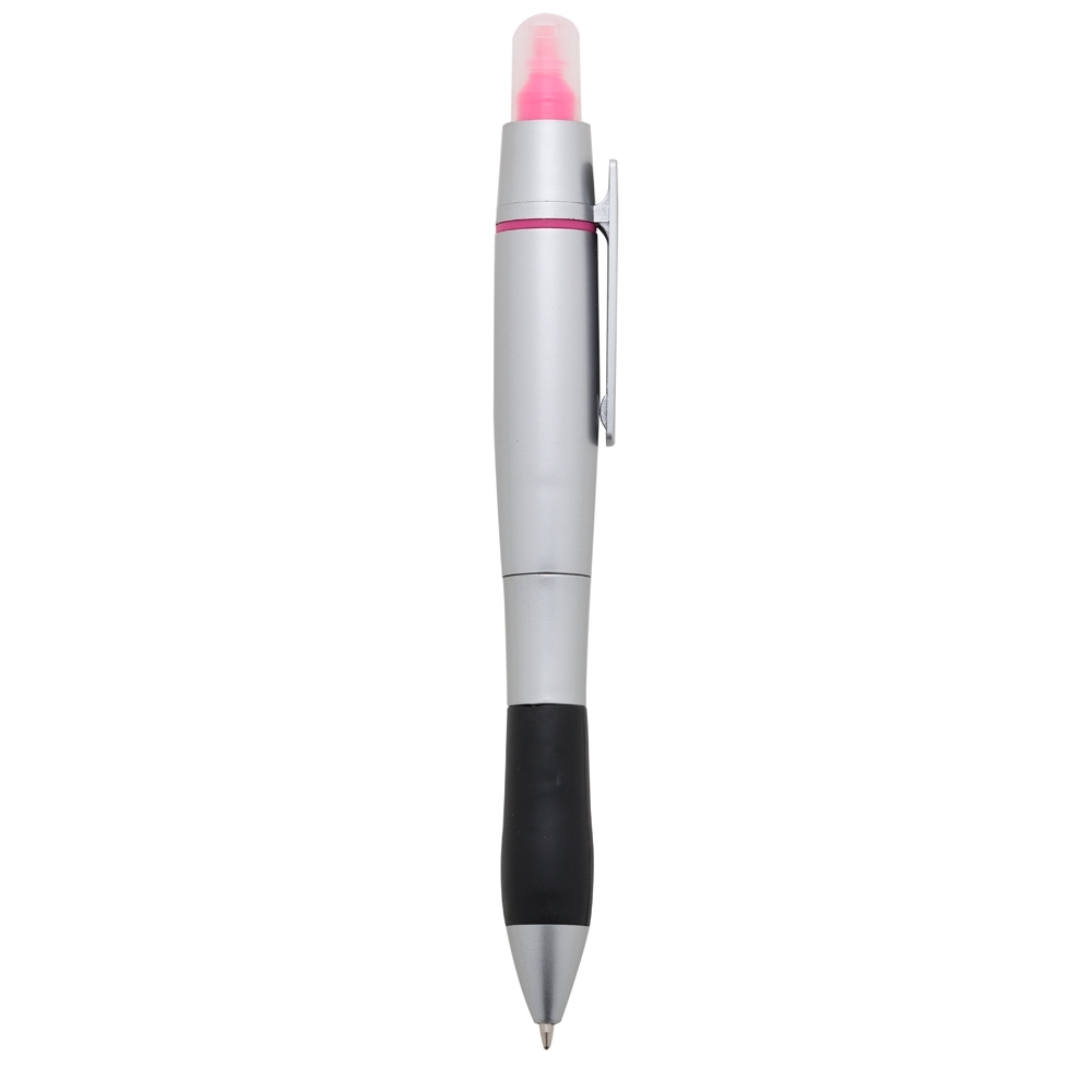 Caneta plástica personalizada esferográfica e marca texto, inteira prata com detalhe inferior preto emborrachado. Tampa protetora no marca texto, aciona por clique.