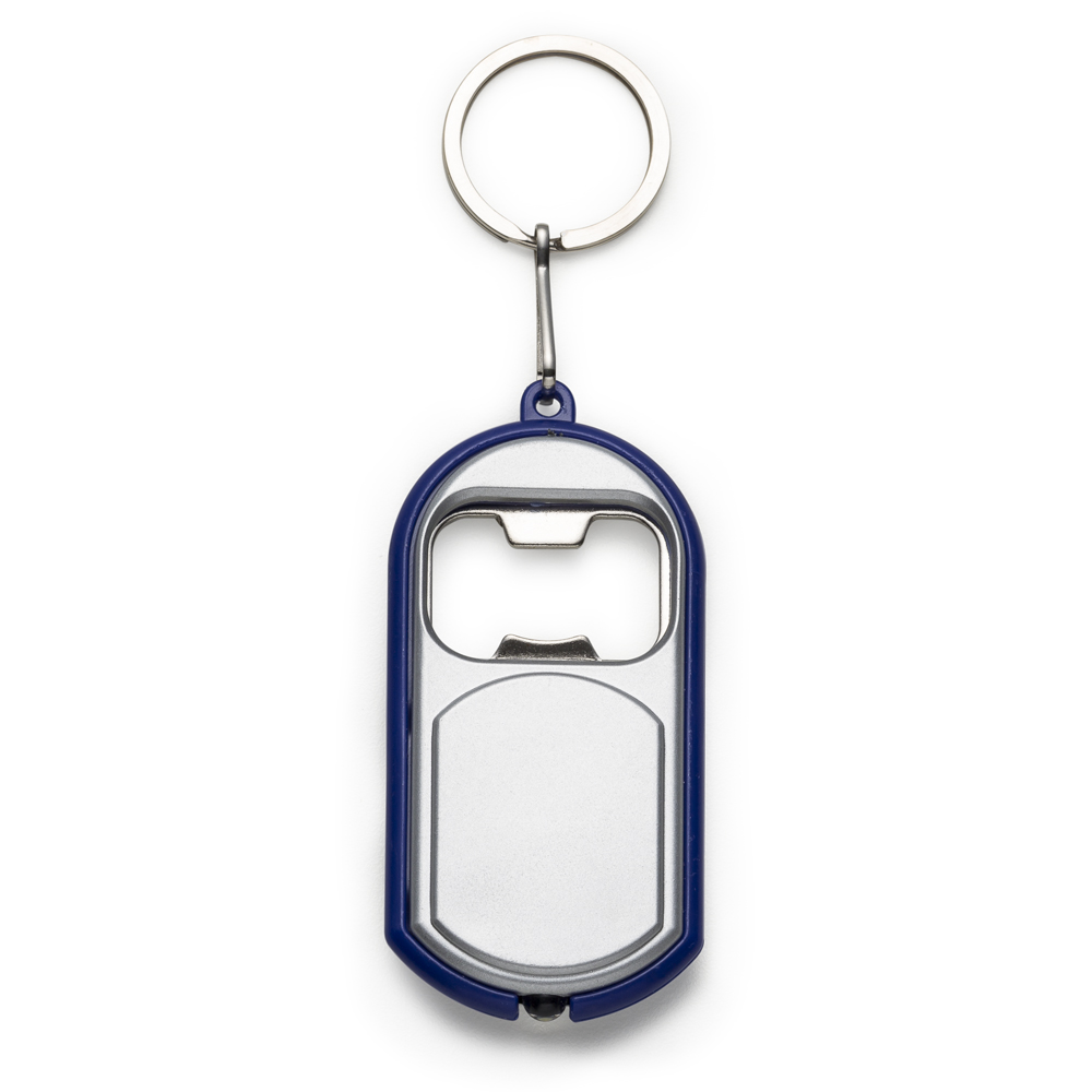 Chaveiro plástico personalizado abridor com lanterna. Possui a lateral colorida e centro prata, frente lisa ideal para personalização e verso com botão para ligar/desligar lanterna. Acompanha três baterias AG1.