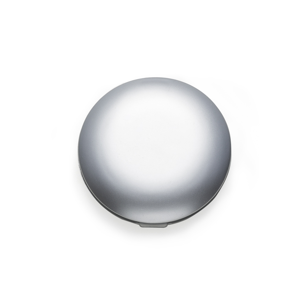 Espelho plástico personalizado redondo duplo com aumento e com luz. Parte superior não é plana(apenas círculo central), verso com tampa aonde localiza-se as baterias(quatro baterias LR41). Possui luzes na lateral interna inferior.