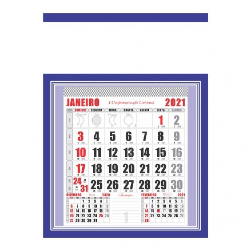 Folhinha Comercial Grande Azul - Com Furo 50LG - Cartela Formato 275x375mm - Papelão Triplex 350g - Bloco Formato 207x232mm - Papel Off-Set 63g - Impressa em 2x2 Cores. ACOMPANHA CARTELA + BLOCO 12 MESES.