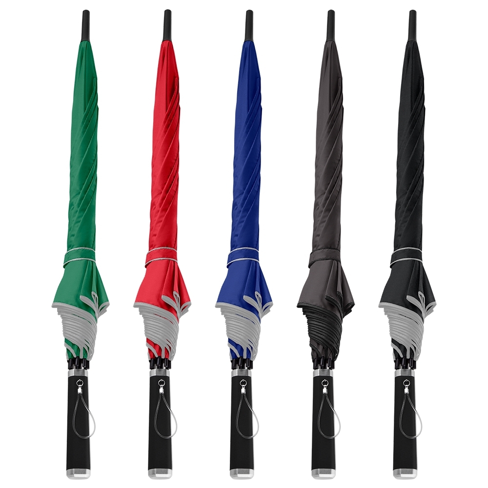 Guarda-chuva colorido em tecido de nylon. Pegador plástico, possui botão de acionamento automático. Possui 8 varetas pretas de metal e bico superior de plástico. Acompanha alça de transporte.