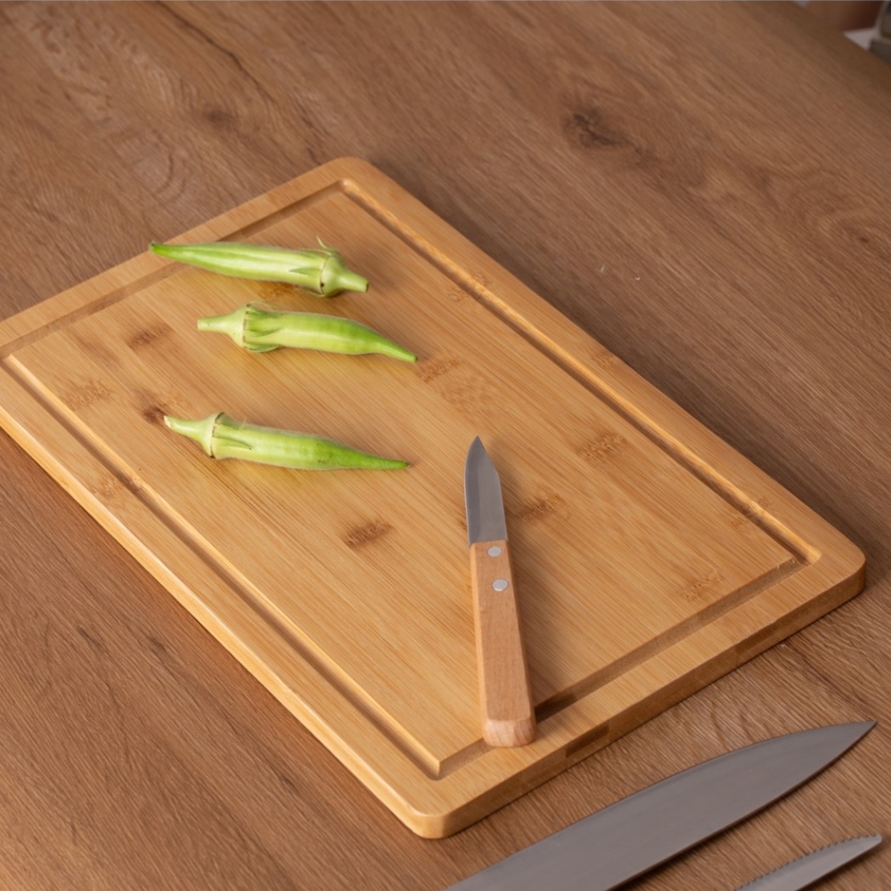 Kit Churrasco 5 Peças com Tábua de Bambu. Contém Tábua de bambu com canaleta, faca, faca de serra, faca pequena com ponta e garfo em inox com cabo de madeira.