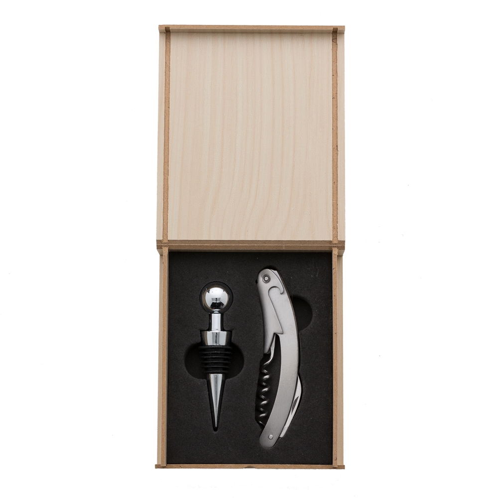 Kit vinho 2 peças personalizado em estojo de madeira. Parte interna revestida com espuma, acompanha tampa de bico e saca rolhas.