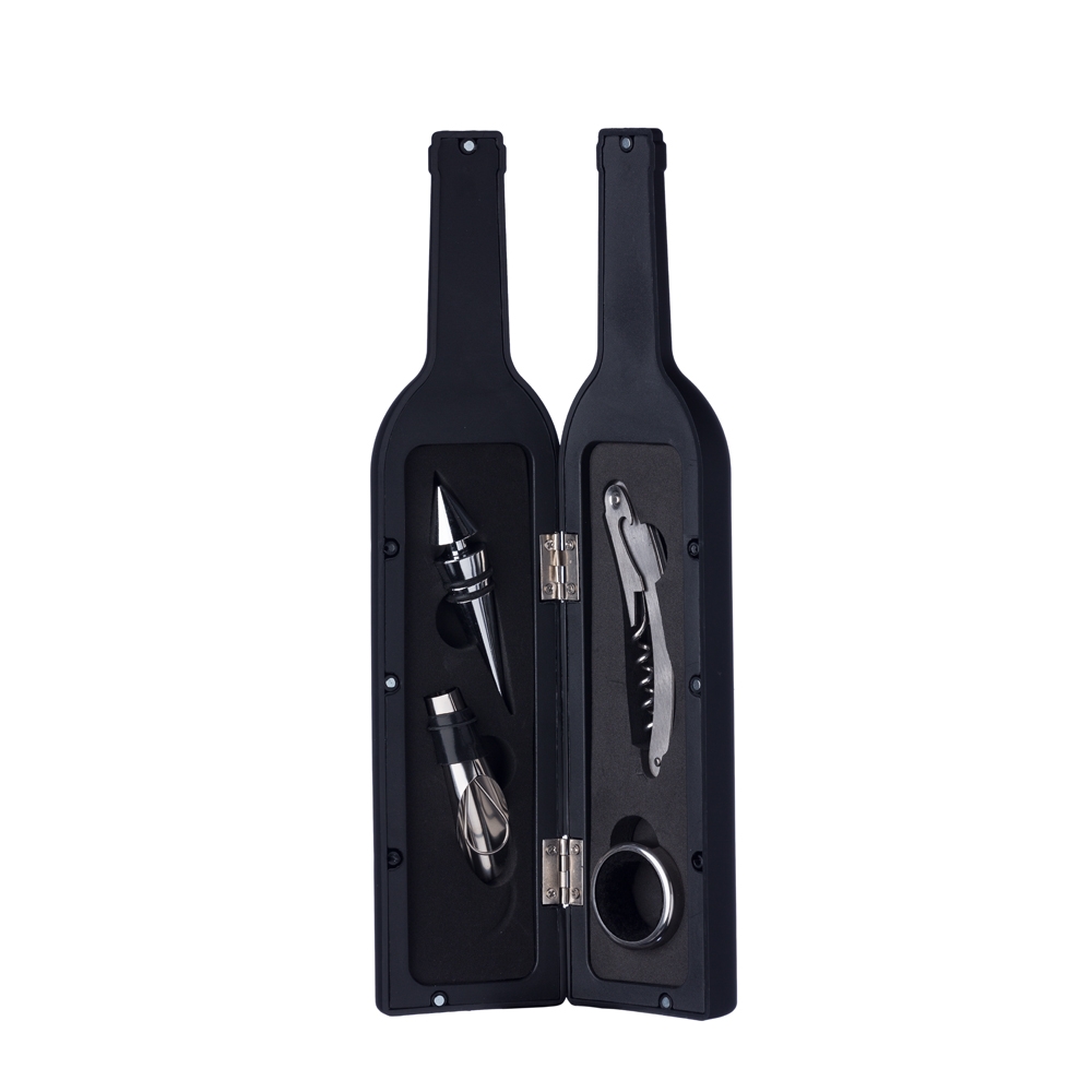 Kit vinho personalizado formato garrafa com 4 peças, material plástico fosco resistente revestido internamente com espuma. Possui tampa de bico, bico condutor com tampa, saca rolhas e wine collar. Fecha por um mecanismo de imã e encaixe.