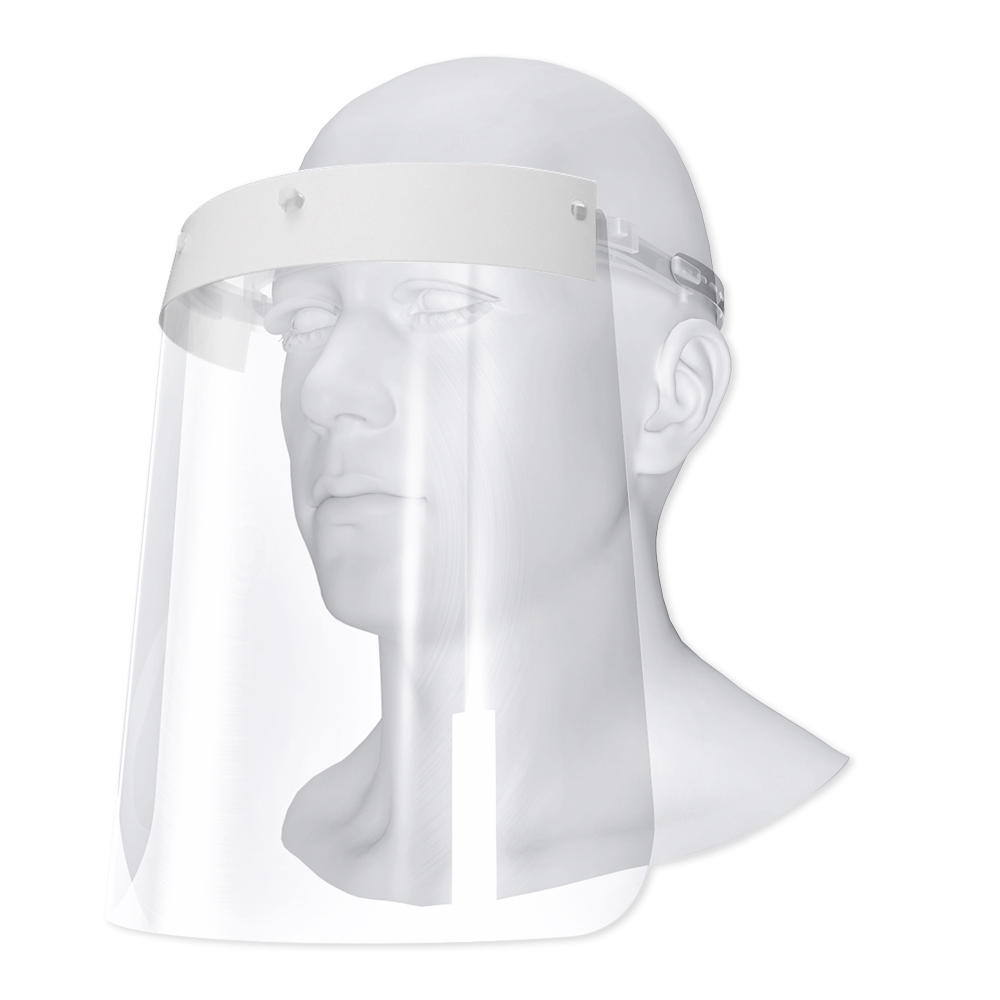 Máscara PETG de proteção facial, sua utilização evita o contato com gotículas, salivas e fluídos nasais que possam atingir a face. Contém: visor PETG 100% transparente, suporte com testeira revestida em PVC expandido e elástico regulável de silicone. Para montagem do protetor facial, fixe o elástico nos pinos das extremidades do suporte, posteriormente remova a película protetora do PETG e faça o encaixe nos quatro pinos do suporte.