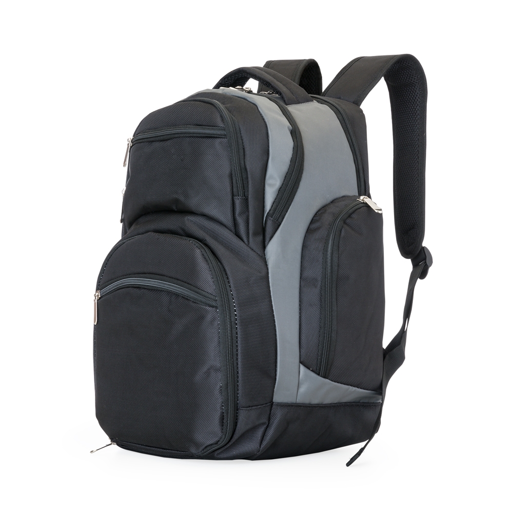 Mochila poliéster personalizada para notebook com detalhes em nylon e neoprene. Possui compartimento grande com bolso interno, compartimento médio com detalhe interno, dois compartimentos frontais pequenos, compartimento térmico e compartimento pequeno frontal. Mochila preta com detalhes cinza, possui dois bolsos laterais e alça revestida com espuma para um maior conforto.