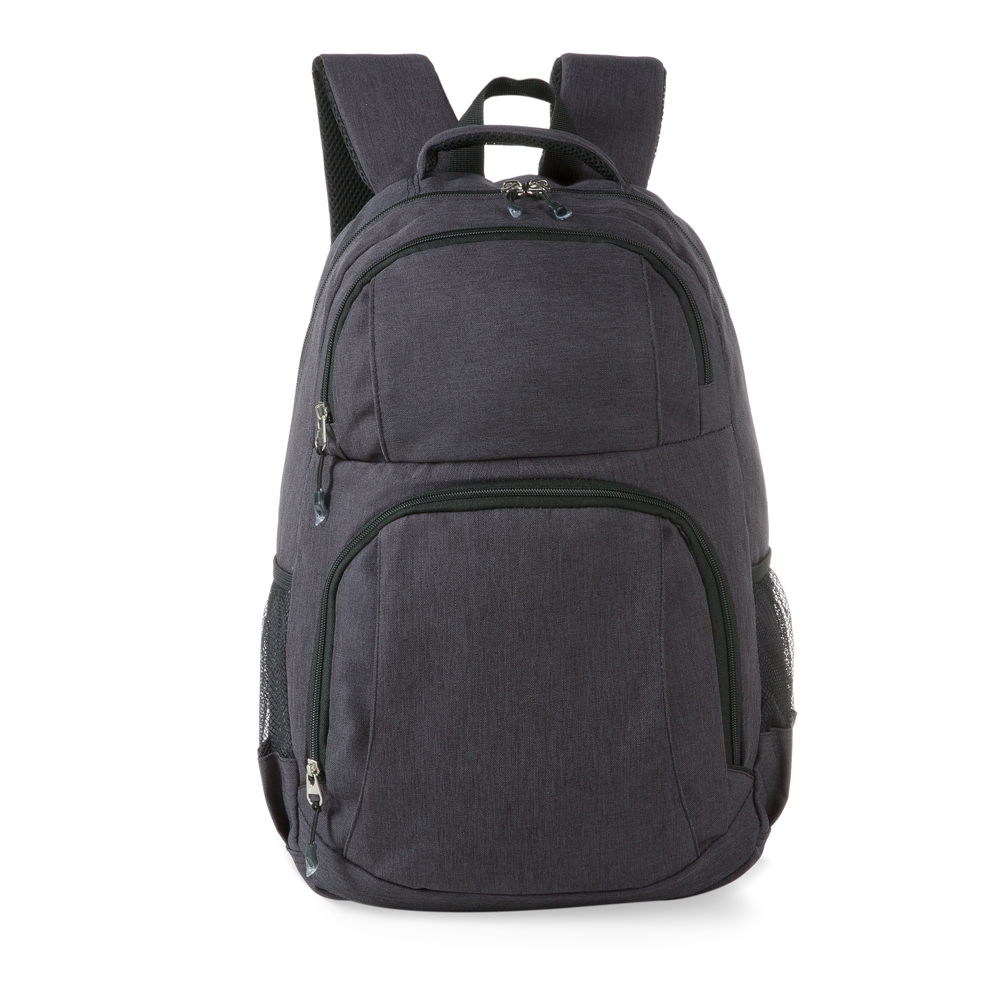 Mochila de nylon personalizada com compartimento para notebook e detalhes neoprene. Possui compartimento grande com bolso interno; compartimento frontal superior, compartimento inferior com divisórias para canetas e documentos, dois bolsos laterais de tela(nylon). Zíperes com puxador plástico, alça de nylon e alças para costa ajustáveis revestidas com espuma.