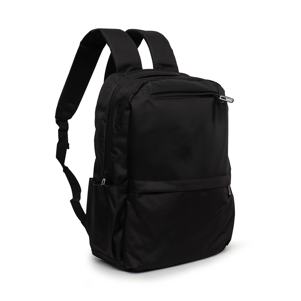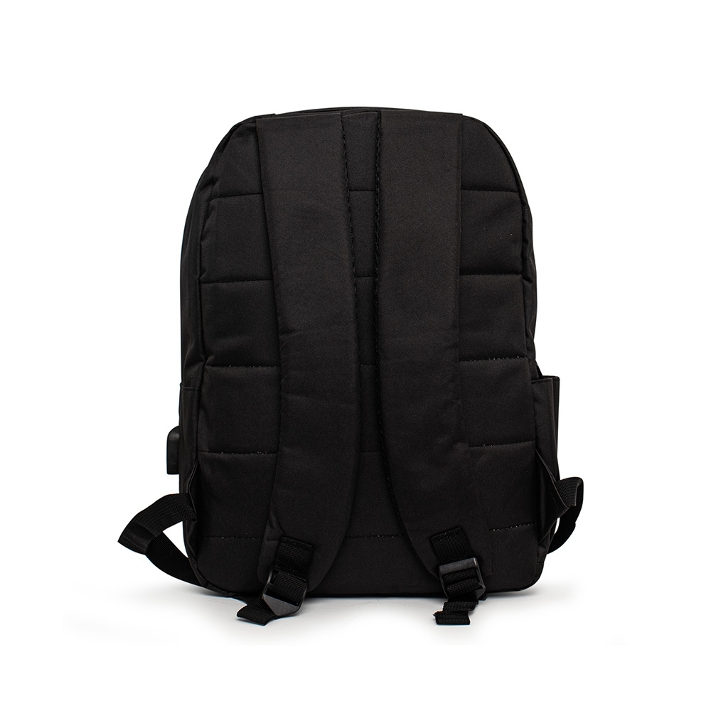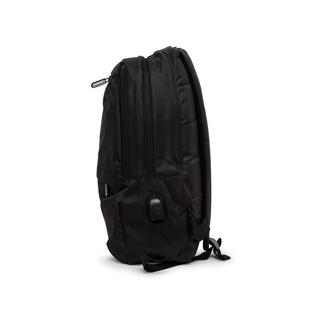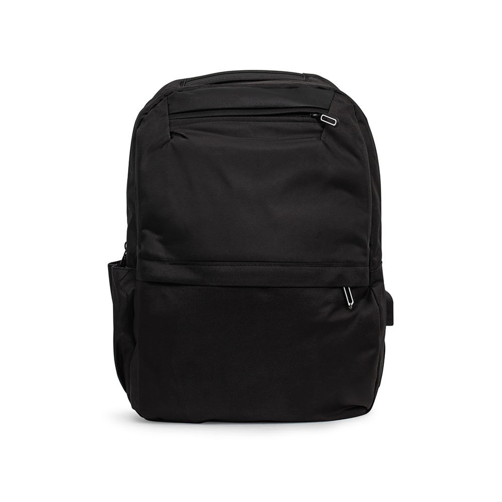 Mochila de nylon 24 litros com três compartimentos personalizada, sendo o principal com bolso para notebook 14 polegadas. A mochila possui um bolso lateral e suporte externo usb.