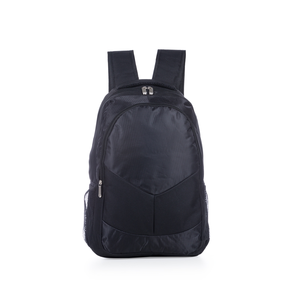 Mochila poliester para notebook com detalhes em nylon e neoprene. Possui compartimento grande com bolso interno, compartimento médio, dois bolsos laterais de rede, alça superior e alça traseira com espuma para um maior conforto.