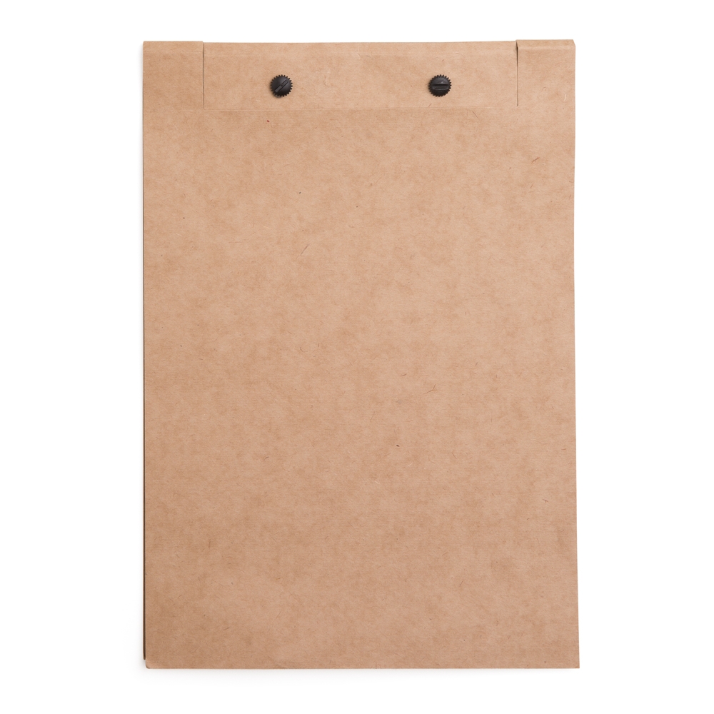 Pasta convenção personalizada em kraft de frente e verso liso, parte superior com dois parafusos plásticos rosqueáveis na cor preta. Abertura superior, acompanha 25 folhas ecológicas de tamanho A4.
