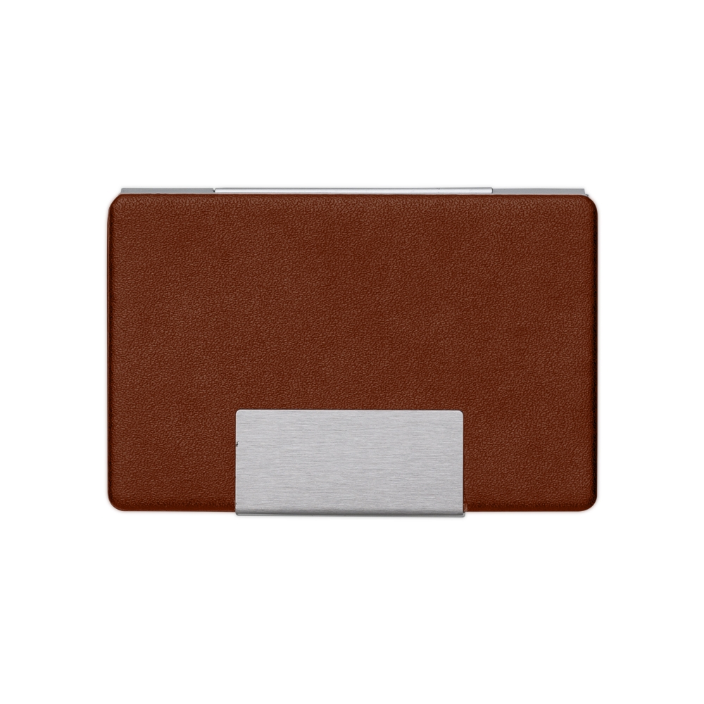 Porta cartão personalizado em couro sintético texturizado com placa metálica para personalização. Parte interna de alumínio fosco.