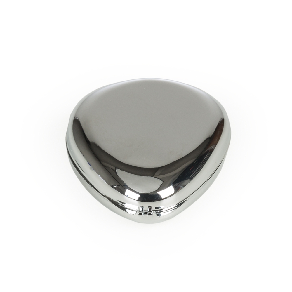 Porta comprimido personalizado de metal com 3 divisórias. Parte superior com área central oval fosca e verso espelhado. Parte interna plástica com três divisões.