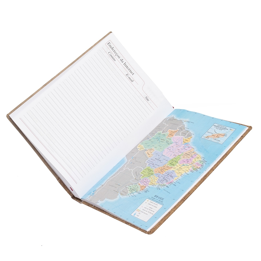 Agenda 2025 de couro sintético personalizada. Contém páginas de dados pessoais, calendário 2024 à 2026, marcador de página, mapa do Brasil, mapa mundi, índice telefônico e planejamento. OBS.: PEDIDOS APENAS MÚLTIPLOS DE 10 PEÇAS!