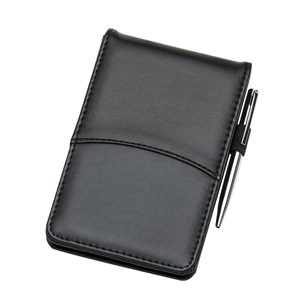 Bloco de anotações personalizado com capa de couro sintético. Possui calculadora solar plástica de 8 dígitos, uma caneta plástica com clip de metal acionada por giro e bloco de anotações pautado(verso branco) com aproximadamente 30 folhas.