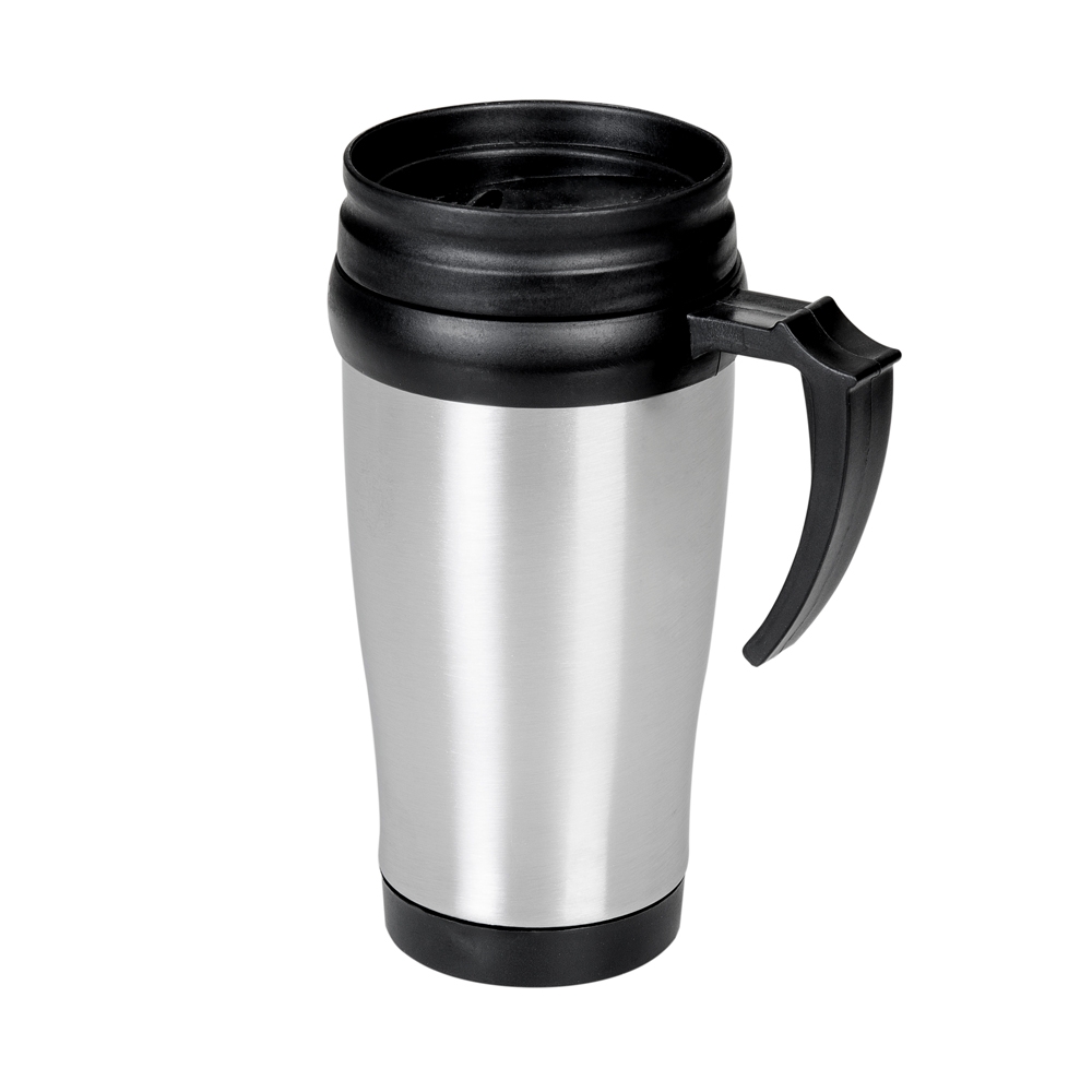 Caneca inox de 400ml revestida internamente com PVC personalizada, pegador e detalhes em plástico resistente. Tampa rosqueável, possui compartimento que pode ser aberto para beber(não é térmica).