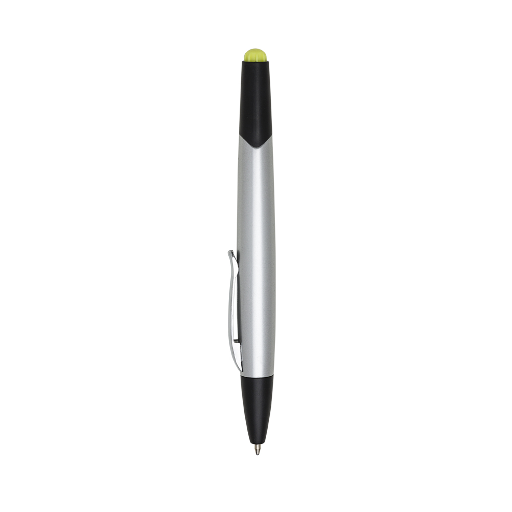 Caneta plástica personalizada com marca texto inteira prata com detalhes preto. Clip de metal, para utilizar marca texto basta puxar a tampa preta aonde possui um detalhe colorido sinalizando o marca texto e do outro lado esferográfica aciona por giro.