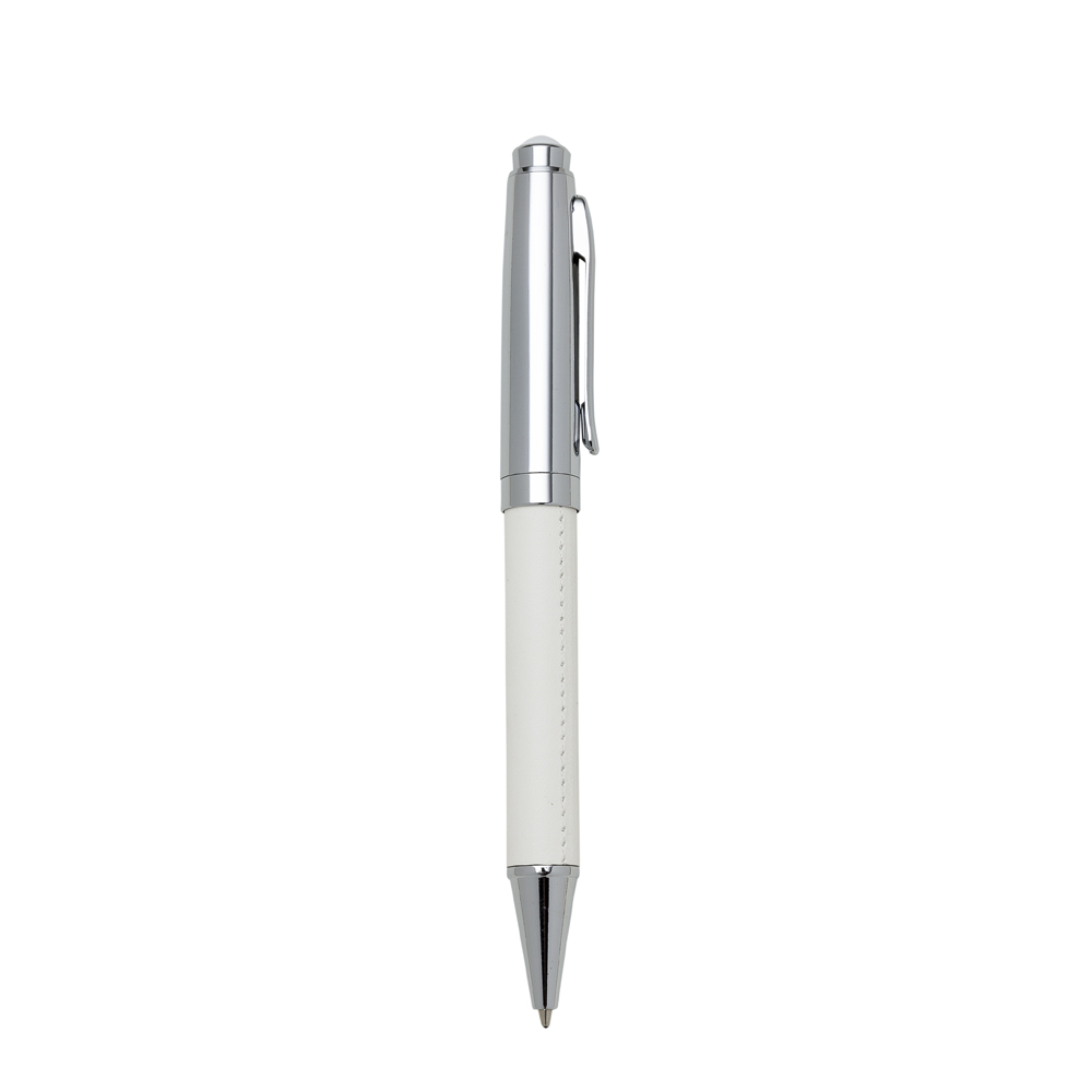 Caneta metal personalizada prata com 3 versões. Clip metal e ponta superior colorida, tem as versões couro branco, couro preto, e prata texturizado. Aciona por giro.