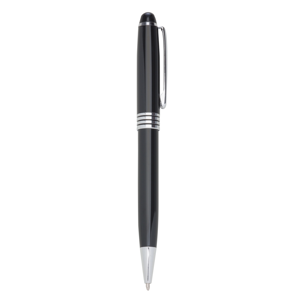 Caneta metal personalizada preta com detalhes prata. Clip metal com detalhe em relevo, possui anel superior e três aneis centrais. Aciona por giro.