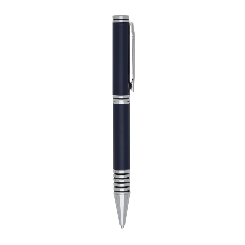 Caneta metal personalizada inteira colorida com detalhes prata. Clip metal, possui anel preto em relevo na parte superior e no centro. Seis anéis prata na parte inferior com um detalhe preto. Aciona por giro.