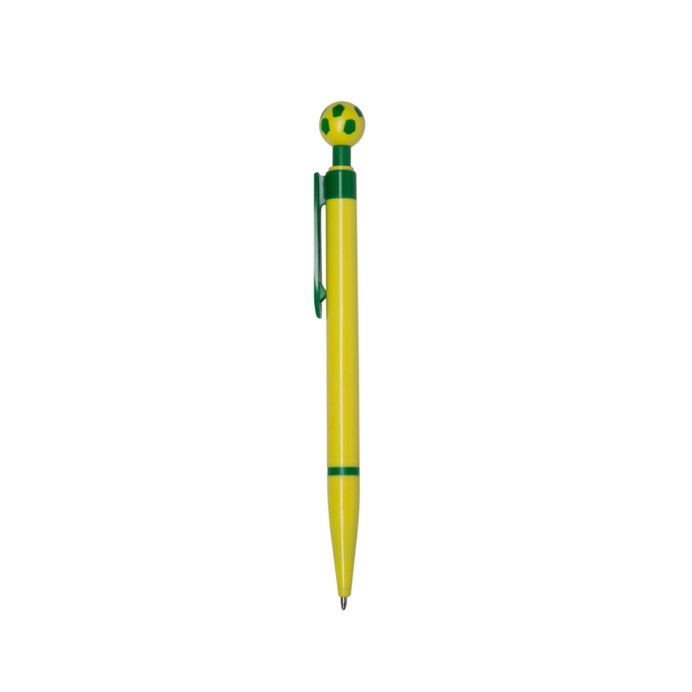 Caneta plástica personalizada amarela com detalhes verdes. Possui bola de futebol no clip, parte inferior com anel verde. Aciona por clique.