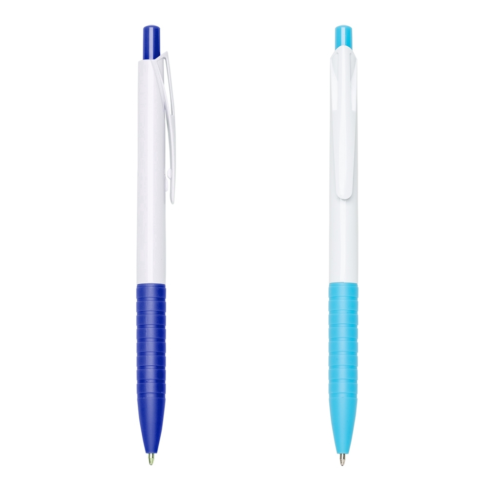 Caneta plástica branca com detalhes em azul. Clip plástico com detalhe vazado nas laterais, acionador e parte inferior colorida com oito anéis em relevo. Aciona por clique.