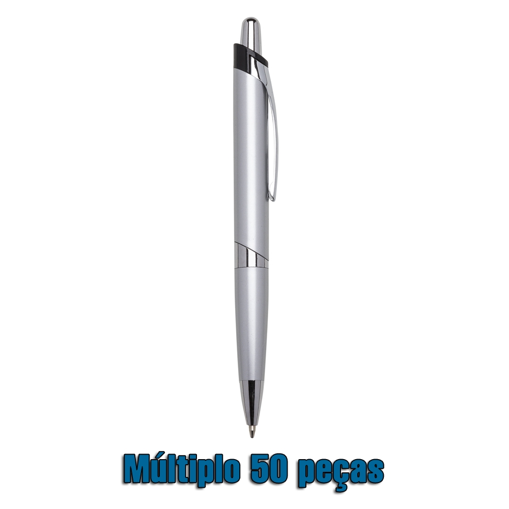 Caneta plástica personalizada, inteira prata com detalhes coloridos. Possui clip de metal com um furo e um traço vazado, suporte do acionador preto e anel central prata. Aciona por clique. PEDIDO APENAS MÚLTIPLO DE 50 PEÇAS!