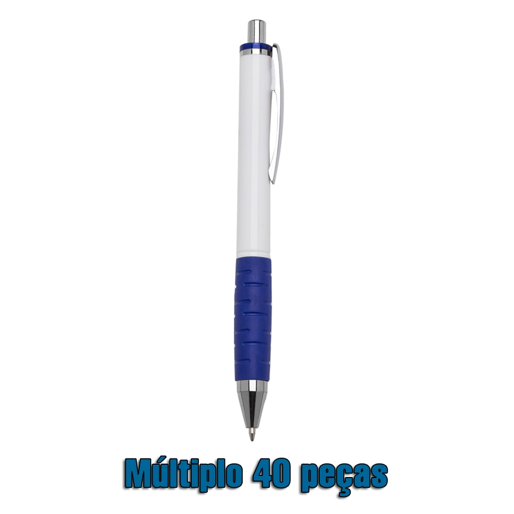 Caneta plástica personalizada, inteira branca com detalhes emborrachados coloridos em relevo. Possui anel colorido entre o acionador, clip de metal. Aciona por clique. PEDIDO APENAS MÚLTIPLO DE 40 PEÇAS!