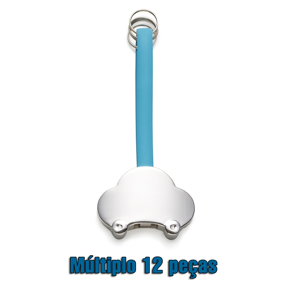 Chaveiro metal personalizado cabo de dados Iphone. Possui quatro argolas,borracha azul com adaptador para Iphone e saída USB(detalhes brancos), apenas transfere dados. Carro de metal espelhado liso de ambos lados. PEDIDO APENAS MÚLTIPLO DE 12 PEÇAS!