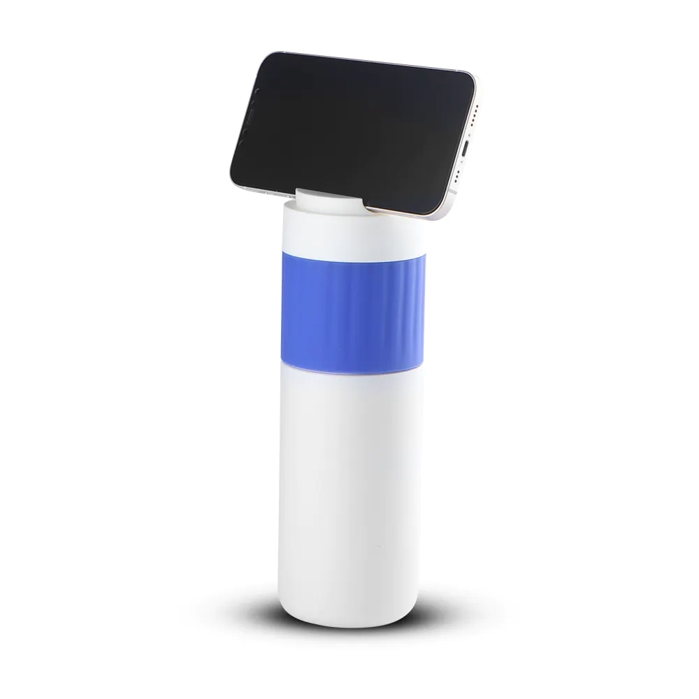 Garrafa térmica de inox com capacidade de 500ml. Tampa com alça e suporte para celular. Detalhe emborrachado. Altura : 21,3 cm Largura : 6,9 cm Circunferência : 22,4 cm Medidas aproximadas para gravação (CxL): 8 cm X 3 cm Peso aproximado (g): 274