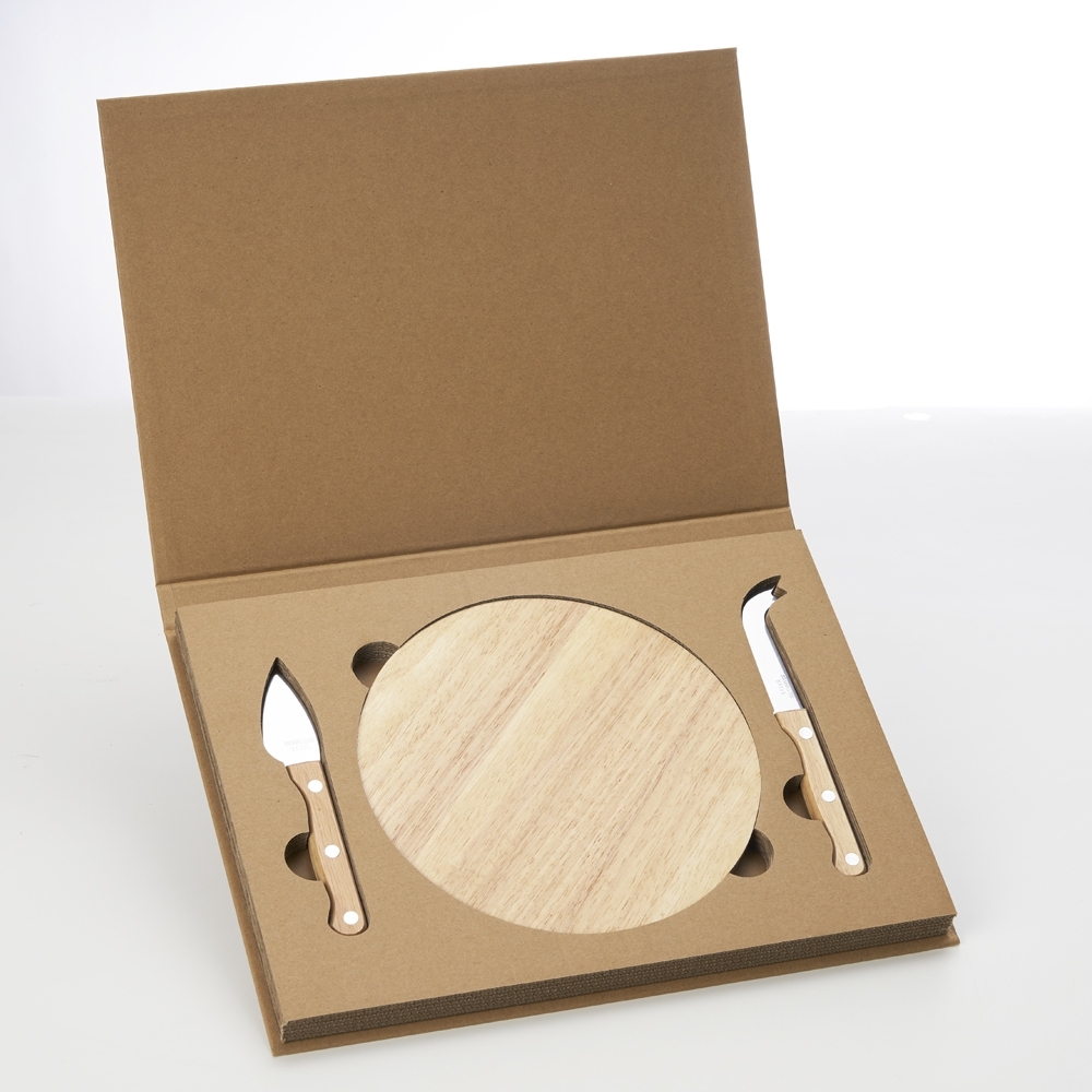 Kit queijo 3 peças em estojo kraft . Contém faca com ponta, faca reta e tábua. Acompanha embalagem de papelão.