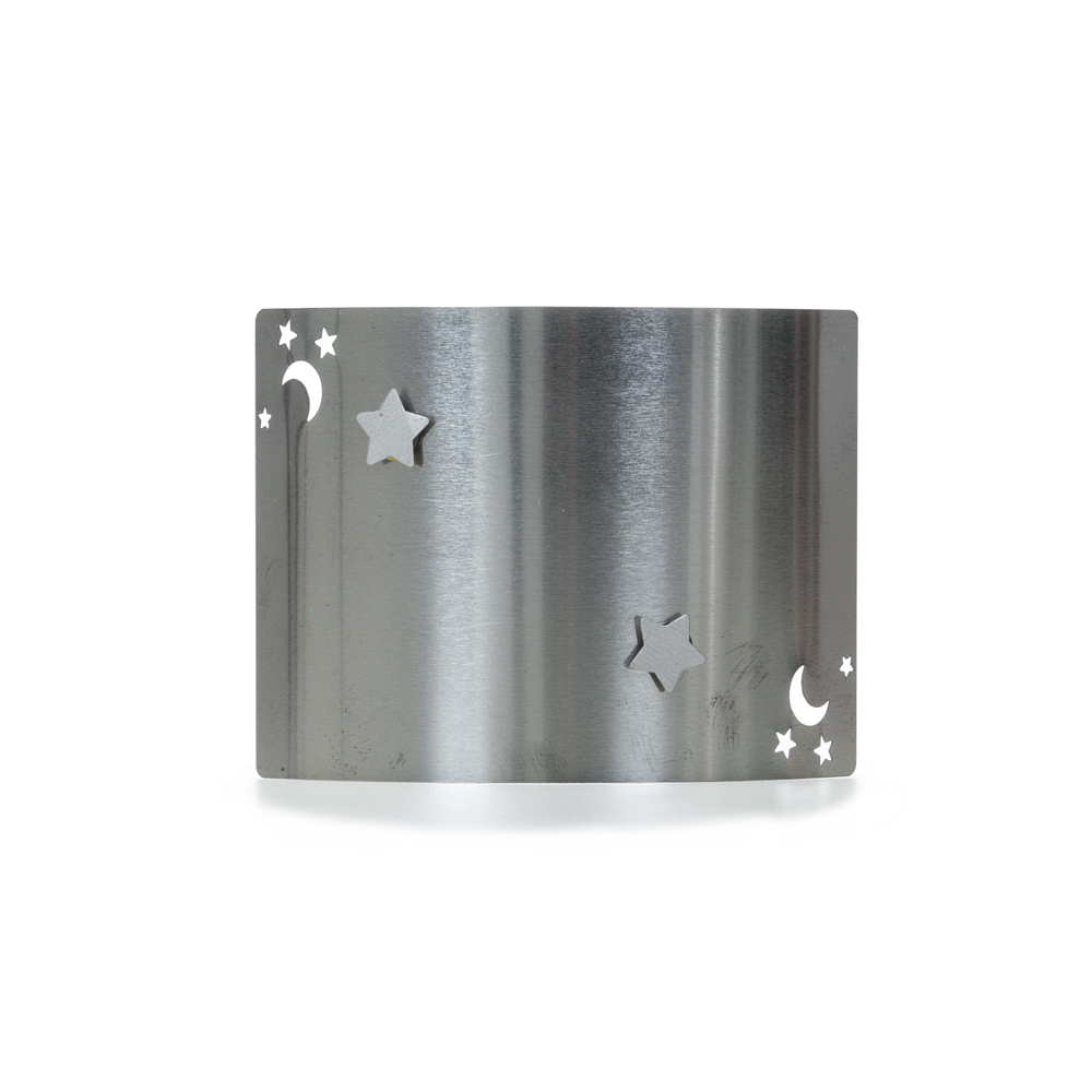 Mini porta-retratos personalizado em inox escovado, modelo chapa metálica curvada acompanha dois “botões” imã e possui o desenho vazado de uma lua e estrelas nas diagonais.