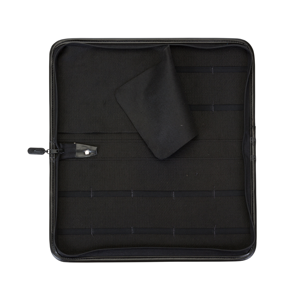 Pasta mostruário para canetas personalizado, material em couro sintético com zíper( “pegador” emborrachado). Cabém aproximadamente 50 unidades de caneta, parte interna de veludo, possui dois elásticos por encaixe para fixar parte inferior e superior melhor, além de um pano protetor para as peças não riscarem ao terem contato umas às outras ao fechar a pasta.