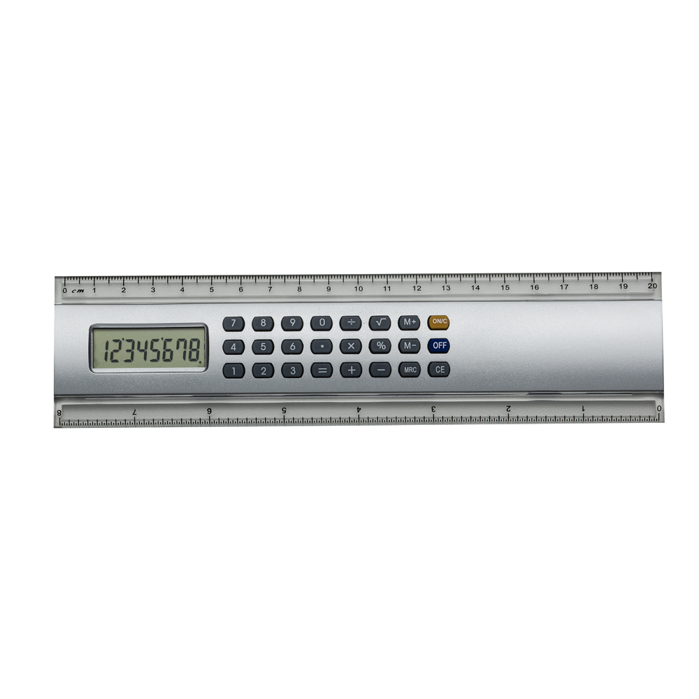 Régua calculadora plástica 20cm personalizada. Calculadora de 8 dígitos com base prata, possui as medidas cm e polegada nas laterais plásticas transparentes. Acompanha uma bateria AG10.