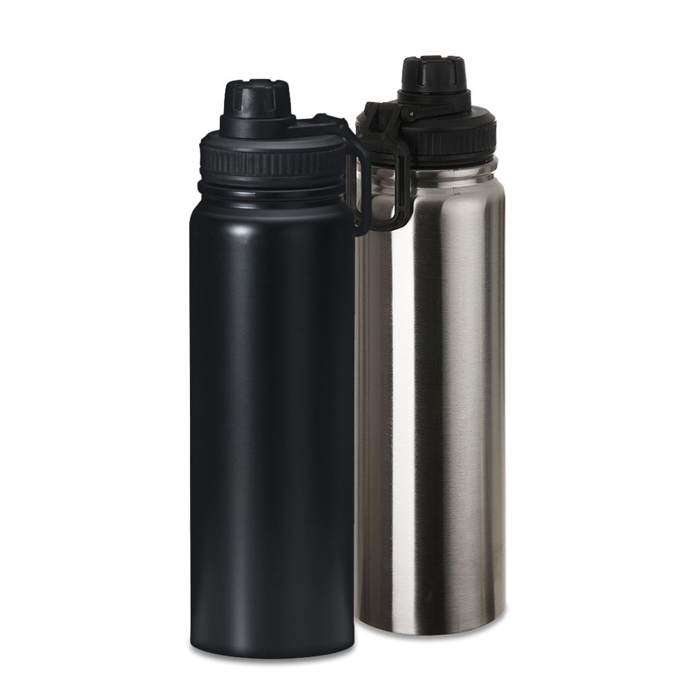 Squeeze metálico 1,1 litro com alça para transporte, possui tampa com detalhe emborrachado e tampa protetora para o bocal.