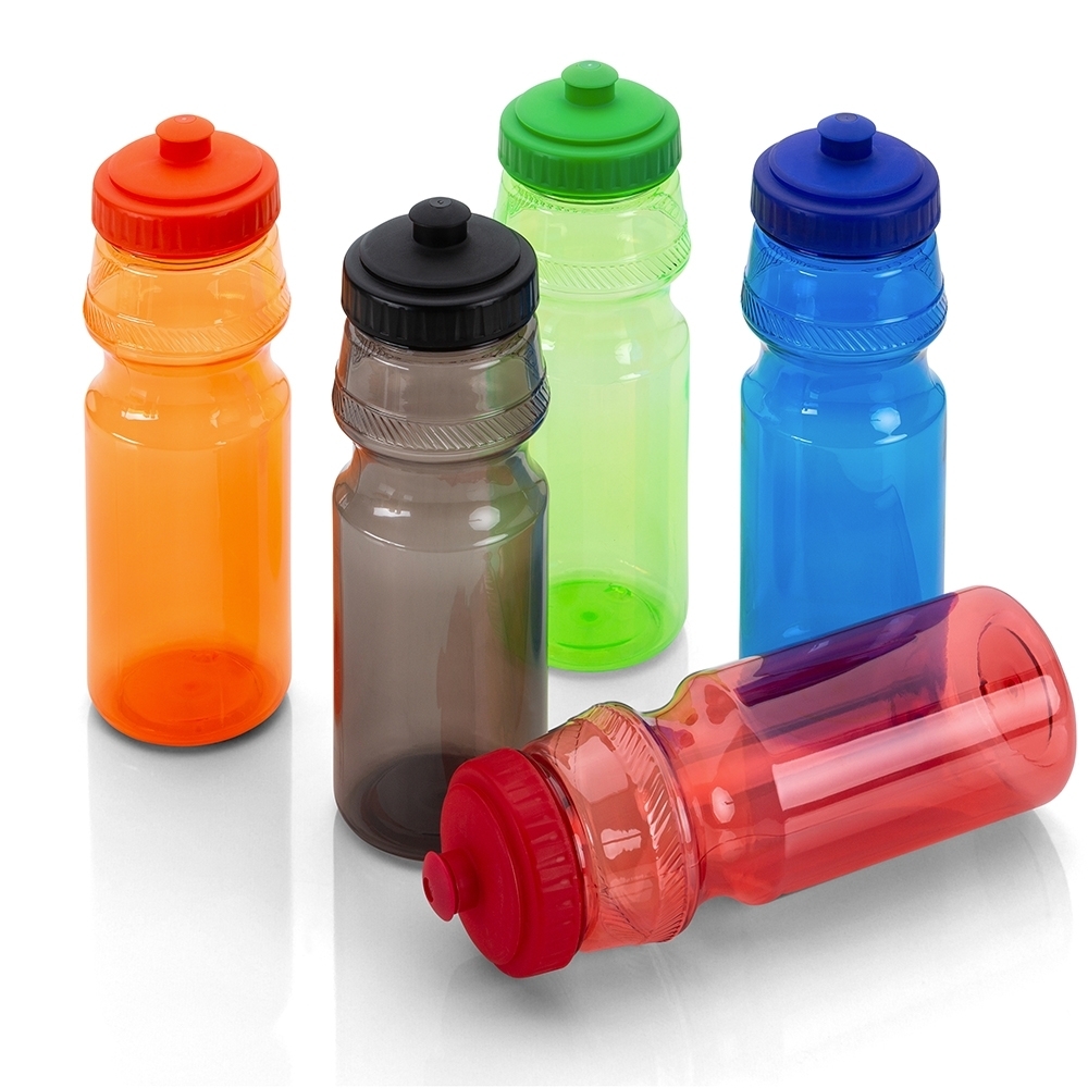 Squeeze plástico 750ml com tampa rosqueável e bico retrátil.
